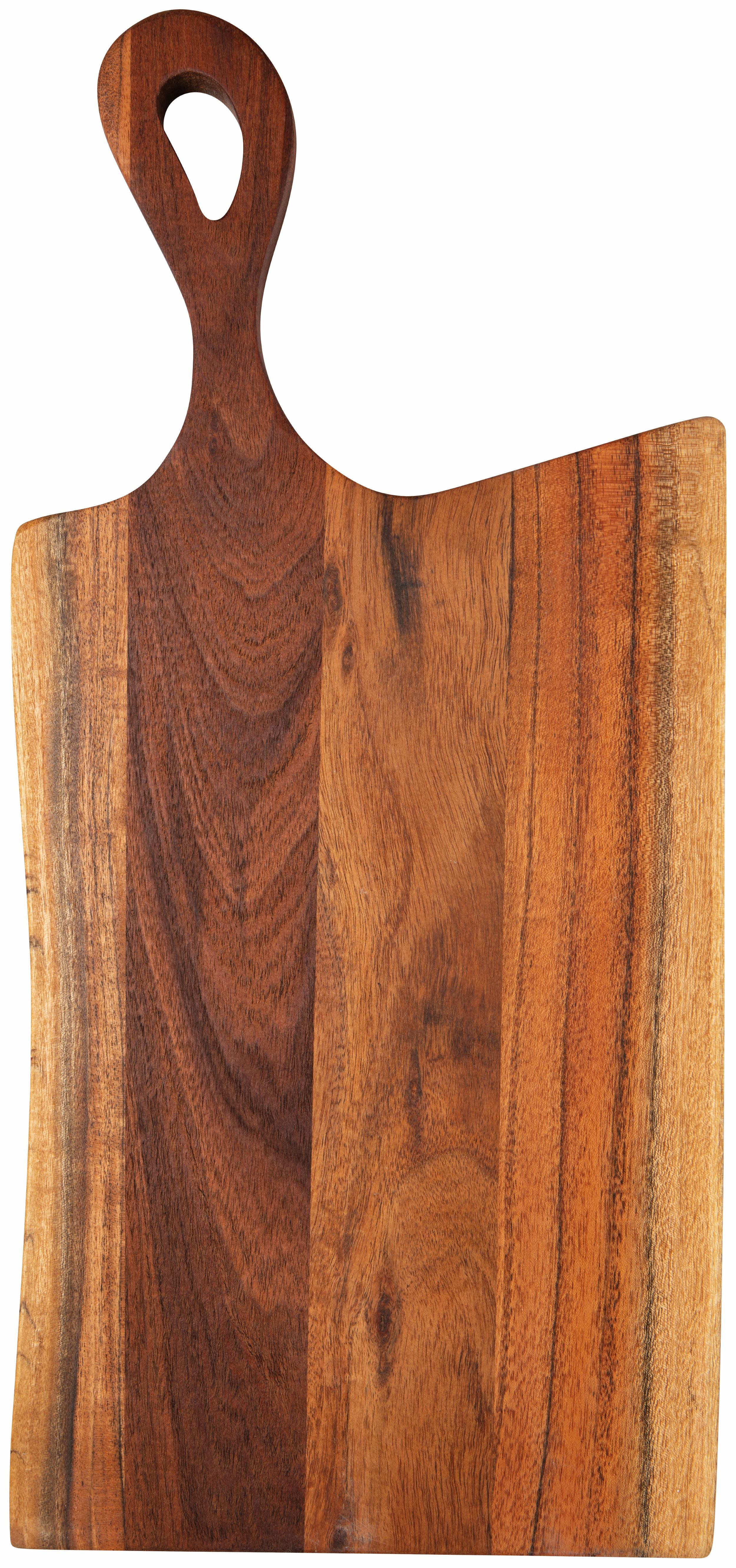 This acacia wood serving board features a unique wood grain pattern and handle, naturally beautiful for entertaining or as decor.