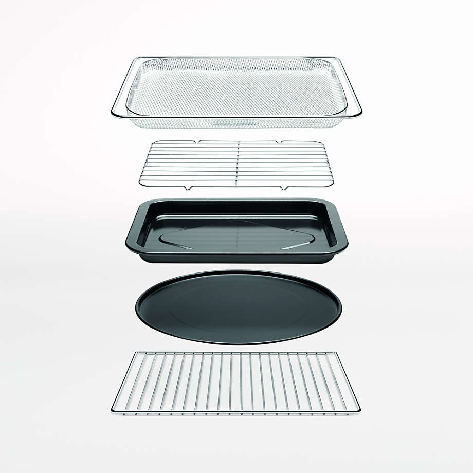 - Includes 13" non-stick pizza pan, 11" x 13" enamel roasting pan, air fry basket, wire rack and broiling rack