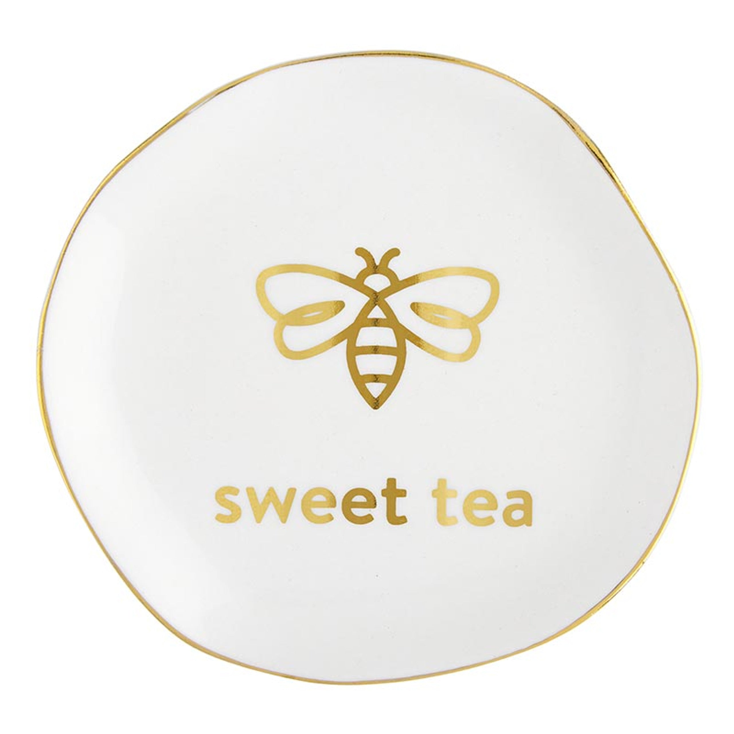 - Unglazed bottom surface, gold foil phrase design, gold rim