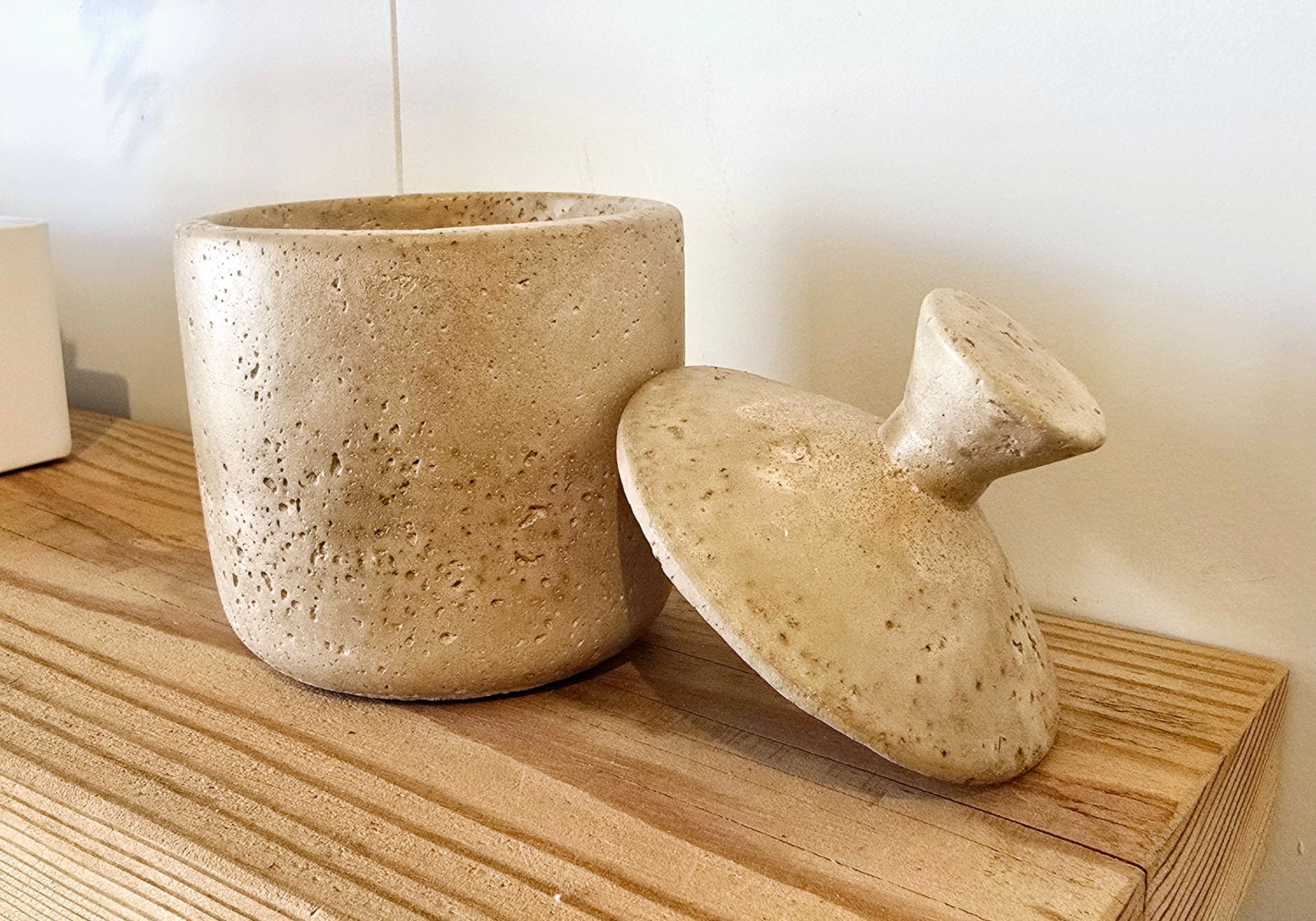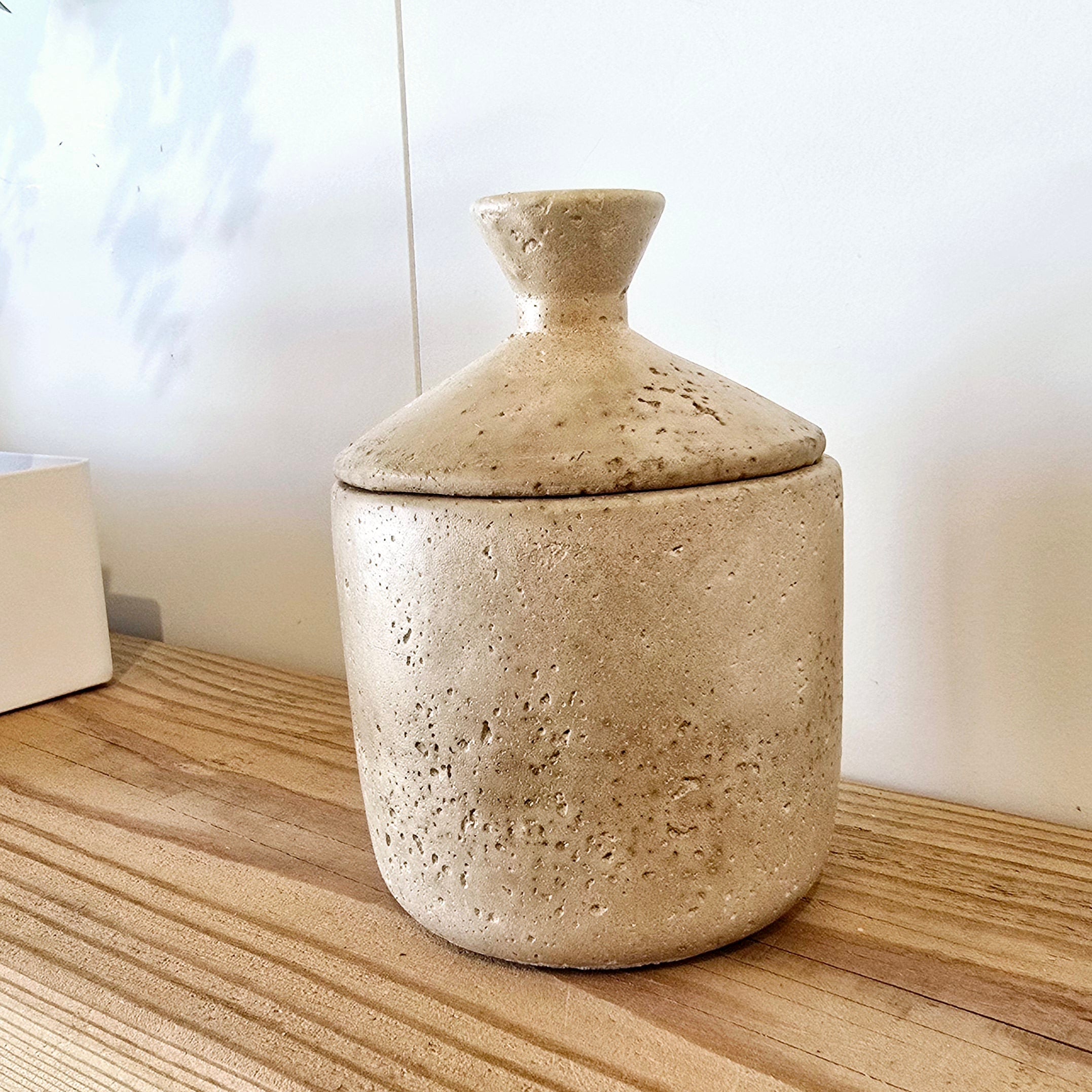 Add a touch of understated elegance to your bathroom or living space with our lidded travertine-look cement jar. Crafted from high-quality cement, this versatile piece features a sleek design and ample storage capacity, making it both stylish and functional.
