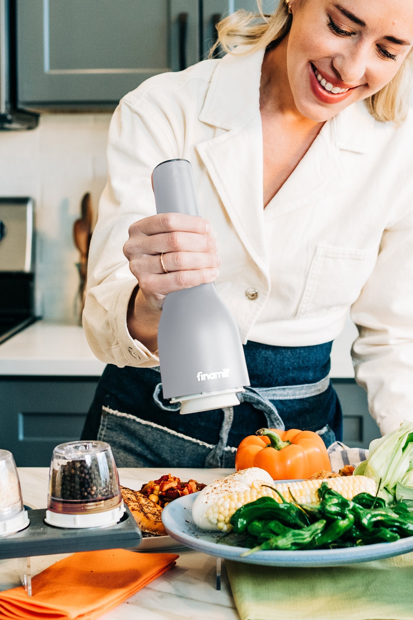 Simply fill a grinding pod with your favorite spice and attach it to the FinaMill. Hold the FinaMill over your food, press the button, and a LED light will illuminate a shower of freshly ground spices. You can operate the FinaMill with just one hand—perfect for multitasking cooks and people with limited mobility. FinaMill grinding pods double as storage for all your spices, and can be swapped in with just a couple clicks. Even the grind size is adjustable; mill dried chiles to a fine grind or coarsely crack black pepper and sea salt.