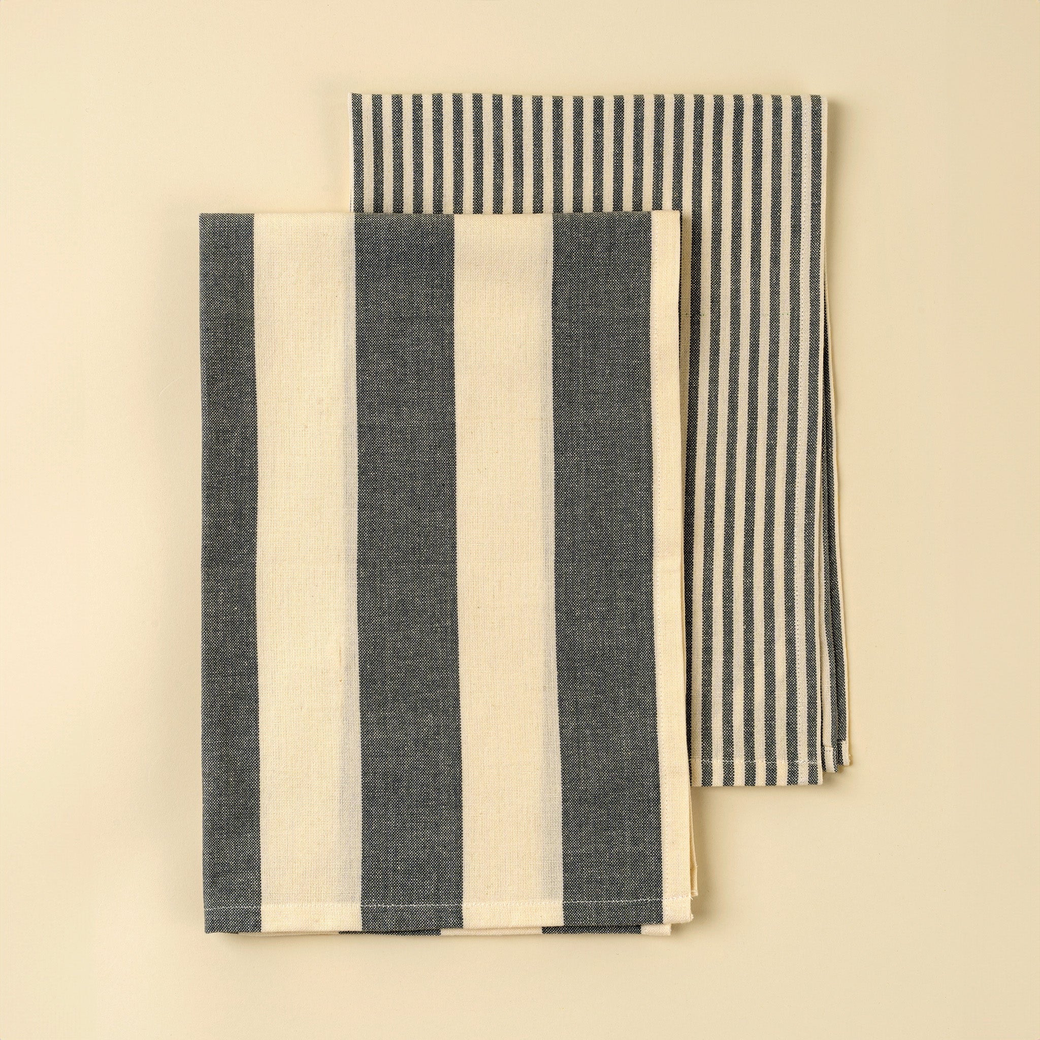 Upgrade your kitchen with the Hampton Stripe Tea Towels, a charming and practical set that doubles as accent decor for the kitchen. Woven from 100% cotton, each towel features a unique stripe design, one wide, one narrow. These handcrafted products are soft, absorbent, and coordinate beautifully with our matching oven mitts to bring cohesive style to your kitchen essentials collection.