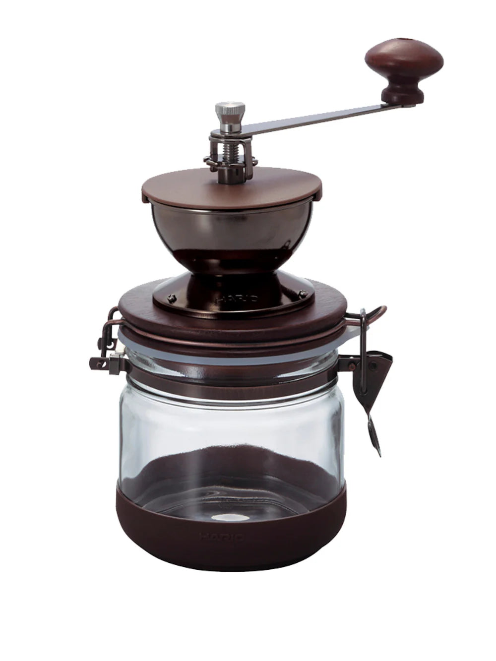This traditional crank style hand grinder uses ceramic burrs to grind coffee, and has a removable and sealable glass jar underneath to store your coffee. Holds 120g of ground coffee.