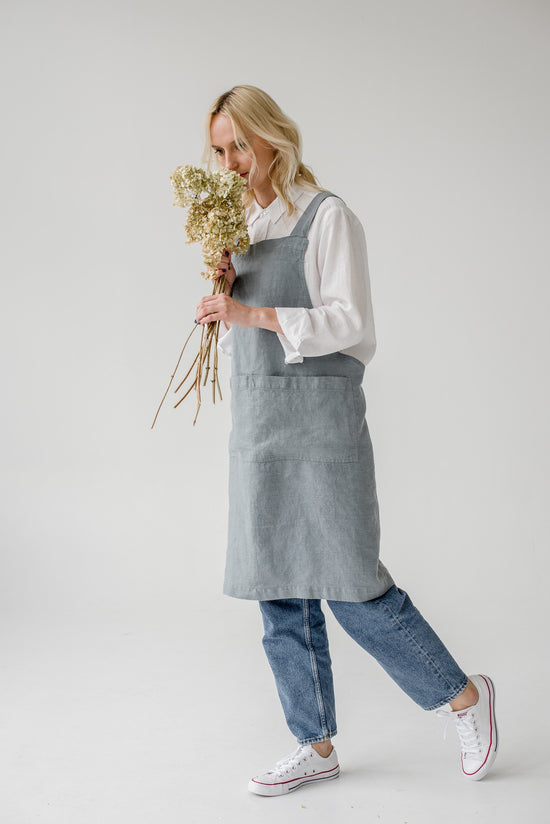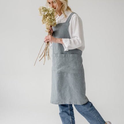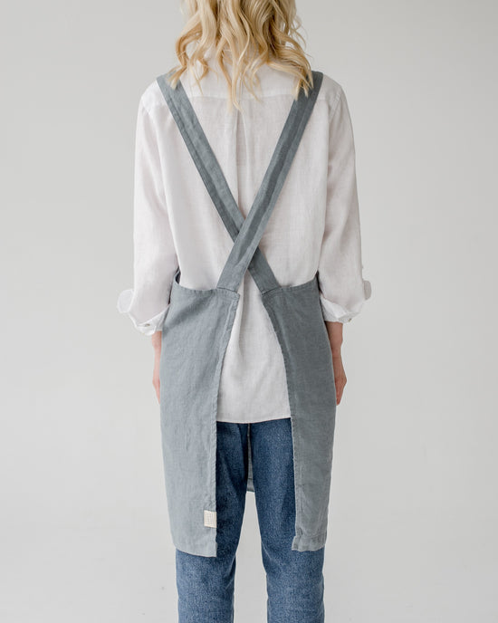 Linen Crossback Apron, Blue Fog