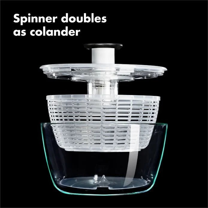The OXO Good Grips Glass Salad Spinner is the quick and easy way to dry greens or herbs—just press the soft, non-slip knob. The spinning basket doubles as a colander, so you can rinse lettuce and more with ease. The non-slip base prevents skidding, and the patented built-in brake button stops the Spinner on a dime for unloading.