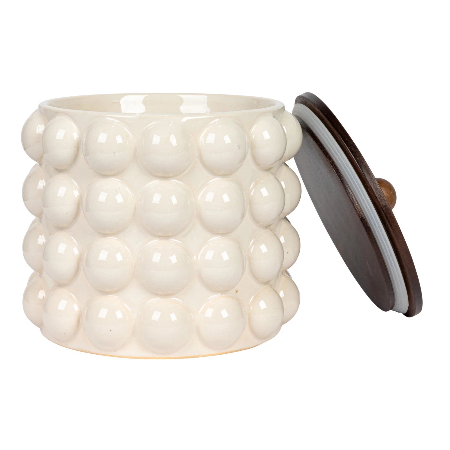 Organize every kitchen with style using this round stoneware canister with a charming raised dot pattern and acacia wood lid that provides a natural and rustic touch, keeping any food fresh and protected. This stoneware canister seamlessly blends into various kitchen styles, from modern farmhouse to contemporary, and can be displayed on countertops, shelves, or islands. Designed for dry food storage, this canister is perfect for keeping the pantry staples fresh and within reach, storing cookies, pasta, rice, cereal, or any other dry goods that require an airtight container.